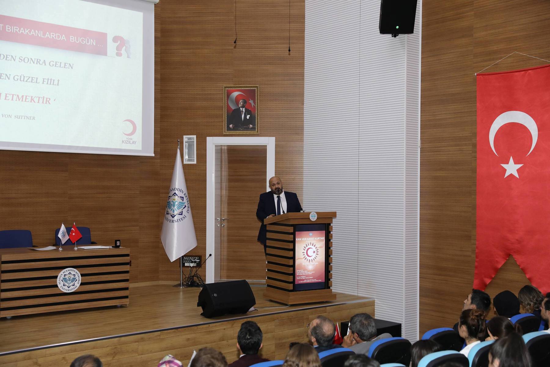 Alanya Alaaddin Keykubat Üniversitesi (ALKÜ) toplumda farkındalık oluşturmak kapsamında önemli alanlarda konferans, etkinlik ve projeler yapmaya devam ediyor. Bu kapsamda son olarak, 29 Ekim – 4 Kasım tarihleri arasında yapılan Kızılay Haftası’nda ALKÜ’de kan bağışı etkinliği ve konferans düzenlendi. Kızılay Haftası kapsamında Eğitim Fakültesi Başöğretmen Atatürk Konferans Salonu’nda gerçekleştirilen etkinliğe ALKÜ Rektör Yardımcısı Prof. Dr. Mehmet Kılıç, Antalya Kan Bağışı Merkezi Müdürü Dr. Okan Erdoğan, Kızılay Alanya Şube Başkanı ve ALKÜ’lü akademisyen Doç. Dr. Mehmet Dikici’nin yanı sıra akademisyenler ile öğrenciler katıldı. Kızılay’ın yardımseverlik, dayanışma ve merhamet ilkelerini hatırlatmak amacıyla düzenlenen program, Saygı Duruşu ve İstiklal Marşı’nın okunması ile başladı. Programın açış konuşmasını yapan ALKÜ Rektör Yardımcısı Prof. Dr. Mehmet Kılıç, “Bugün burada insanlık onurunun, yardımlaşmanın ve dayanışmanın en güzel örneklerinden biri olan Kızılay Haftası vesilesiyle bir arada bulunmaktayız. Bu anlamlı haftada hem tarihimizde hem de bugün toplumumuzda çok önemli bir yer tutan Türk Kızılayı'nın varlığını, değerlerini ve yaptığı fedakârlıkları hatırlatmak için buluştuk. Kızılay; savaş ve barış zamanında, afetlerde ve salgınlarda, nerede bir ihtiyaç sahibi varsa orada olmayı ilke edinmiş, milletimizin vicdanı olmuş bir kurumdur. Kuruluşundan bu yana insan hayatını korumayı, acıları hafifletmeyi ve toplumsal dayanışmayı güçlendirmeyi görev bilmiştir. Bu yönüyle Kızılay, sadece bir yardım kuruluşu değil, aynı zamanda merhamet, gönüllülük ve insanlık bilincinin bir sembolüdür.” dedi.