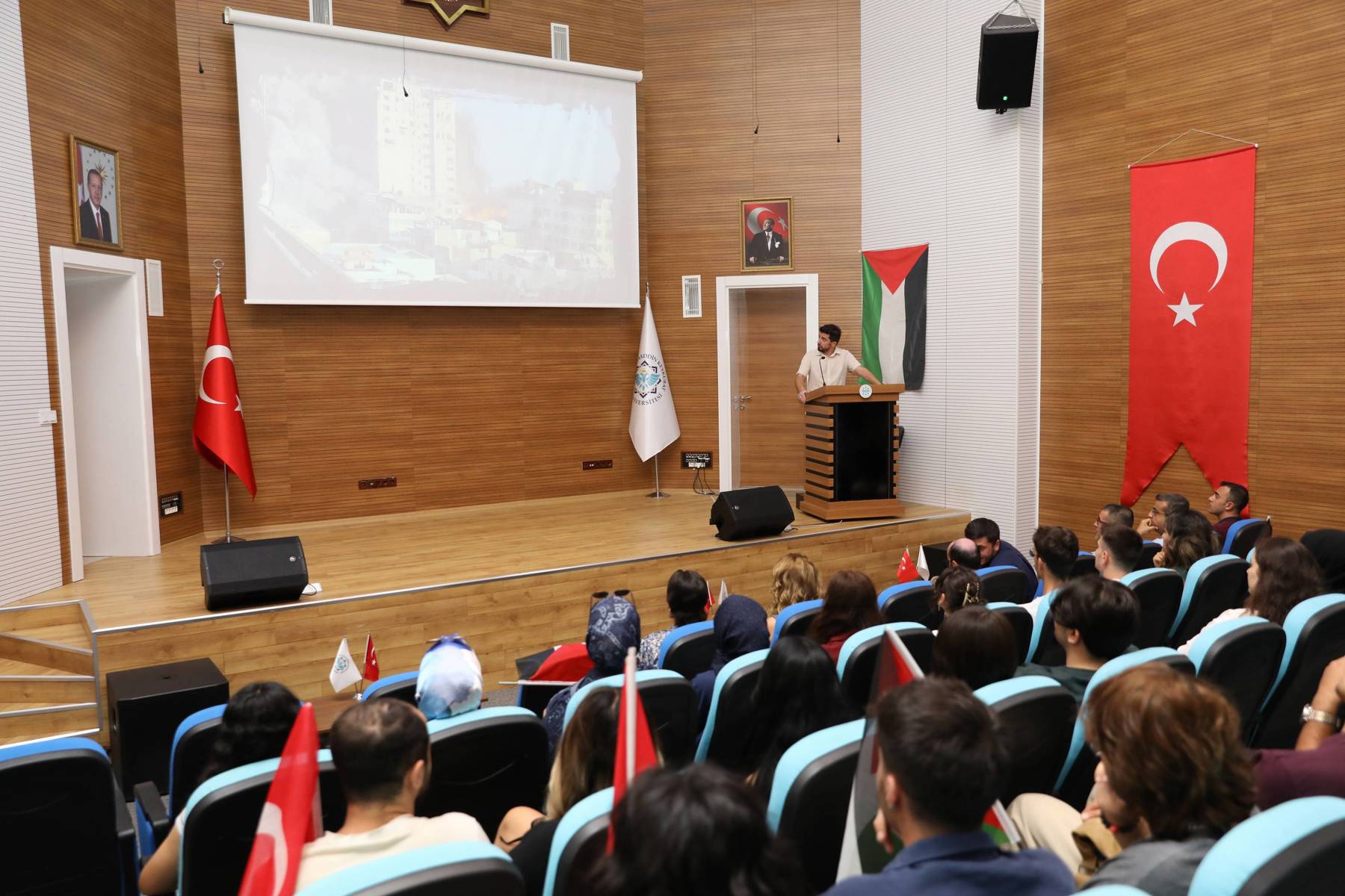 Alanya Alaaddin Keykubat Üniversitesi (ALKÜ); bilimsel çalışmalarının yanı sıra sosyal, ulusal ve uluslararası gelişmelere karşı hassasiyetiyle de dikkat çekiyor. Yükseköğretim Kurulunun (YÖK) üniversitelere gönderdiği çağrıda İsrail saldırılarında sivil halkın hedef alındığı, Filistin’e yıllardır vahşi katliam yapıldığı ifade edilerek yeni akademik yılı açılış töreni ve derslerinde Gazze’nin gündem yapılması istendi. Çağrı kapsamında saat 11.30’da eş zamanlı olarak Eğitim Fakültesi Başöğretmen Atatürk Konferans Salonu, Mühendislik Fakültesi Konferans Salonu, İktisadi, İdari ve Sosyal Bilimler Fakültesi (İİSBF) Konferans Salonu ile tüm fakülte ve MYO’ların sınıflarında gerçekleştirilen ilk derste; İsrail’in Gazze’de yaklaşık iki yıldır sürdürdüğü saldırılar sonucu yaşanan insani dram ve hak ihlalleri öğrencilere aktarıldı. ALKÜ’nün; Gazze’de yaşananlara karşı en başından beri hassasiyet gösterdiği vurgulanarak bu tür insanlık dramlarının hatırlatılmasının bir vicdani sorumluluk olduğunun altı çizildi. Sunum yapan akademisyenler, eğitimin yalnızca bilimsel gelişimi değil aynı zamanda insani ve vicdani duyarlılığı da beslemesi gerektiğini ifade ederek ALKÜ’nün bu konudaki kararlılığını sürdüreceğini belirtti. İİSBF Konferans Salonu’nda yapılan ilk derste İsrail zulmünden kurtularak 9 yıl önce Türkiye’ye gelen Filistin asıllı Maliye Bölümü 3. sınıf öğrencisi Selena Fatayerji, tanık olarak orada yaşananları anlattı. Çocukken tanık olduğu vahşet ve zulümleri yaşlı gözlerle arkadaşlarına aktaran Selena Fatayerji, başta Türkler olmak üzere tüm dünyadan destek istedi. ALKÜ’de yapılan “İlk Ders Filistin” etkinliğinin ardından birlik ve destek çağrısı yapıldı.