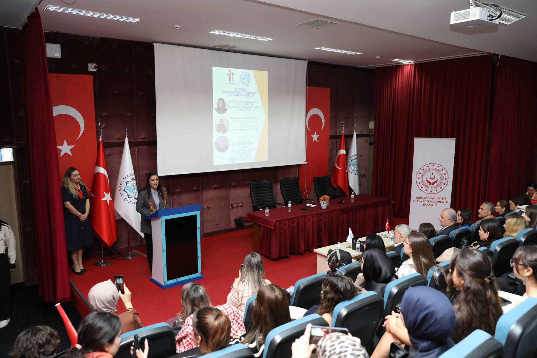 Alanya Alaaddin Keykubat Üniversitesinde (ALKÜ) düzenlenen çeşitli etkinliklerle toplumsal konularda farkındalık oluşturulmaya ve dikkat çekilmeye devam ediliyor. Bu kapsamda ALKÜ Kadın ve Aile Çalışmaları Uygulama ve Araştırma Merkezi tarafından İktisadi, İdari ve Sosyal Bilimler Fakültesi Konferans Salonu'nda “25 Kasım Kadına Yönelik Şiddetle Mücadele Paneli” düzenlendi. Moderatörlüğünü Dr. Öğr. Üyesi Serpil Bardakçı Tosun’un yaptığı panelde, Antalya Barosu Alanya Kadın Hakları Kurulu Başkanı Av. Gülfer Gözütok, Alanya Sosyal Hizmet Merkezi Sosyal Çalışmacı Duygu Urlu konuşmacı oldu. Panele Rektör Yardımcısı Prof. Dr. Atıf Bayramoğlu, ALTSO Yönetim Kurulu Üyesi Adil Memiş, ALKÜ Kadın ve Aile Çalışmaları Uygulama ve Araştırma Merkezi (ALKÜKAM) Müdürü Doç. Dr. Meltem Akca, ALKÜKAM üyeleri, akademisyenler ve öğrenciler katıldı.