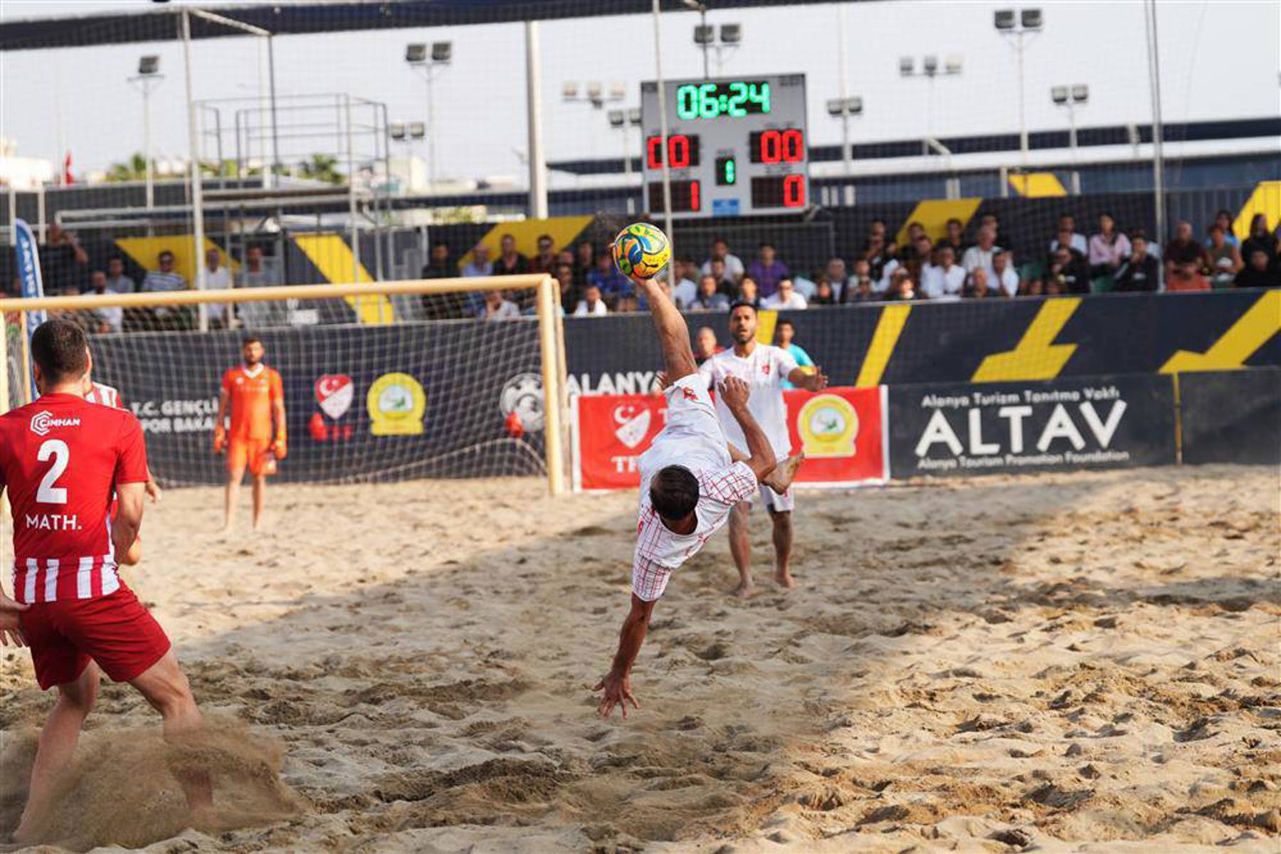 Alanya Uluslararası Plaj Sporları Tesisi’nde gerçekleştirilen TFF Plaj Futbolu Süper Finalleri büyük bir coşkuyla tamamlandı. Türkiye Futbol Federasyonu tarafından Alanya Belediyesi’nin ev sahipliğinde düzenlenen organizasyonun final karşılaşmasını, Alanya Alaaddin Keykubat Üniversitesi (ALKÜ) Rektörü Prof. Dr. Kenan Ahmet Türkdoğan, Rektör Yardımcısı Prof. Dr. Işık Bayraktar, Spor Bilimleri Fakültesi Dekanı Prof. Dr. Hamdi Alper Güngörmüş, Adilcevaz Belediye Başkanı Abdullah Akbaba, Alanya Belediye Başkan Vekili Murat Levent Koçak, Manavgat Belediye Başkan Vekili Mehmet Çiçek, Alanya Belediyesi Başkan Danışmanları Sadık Dizdaroğlu ve Faruk Konukçu, Alanya İlçe Gençlik ve Spor Müdürü Emre Kıldırgıcı ile Plaj Futbolu A Milli Takım Teknik Direktörü Ozan Yılmaz tribünden izledi. Tribünleri tamamen dolduran sporseverler, Alanya ve Manavgat’tan gelen taraftarların coşkulu destekleriyle final atmosferine büyük renk kattı.