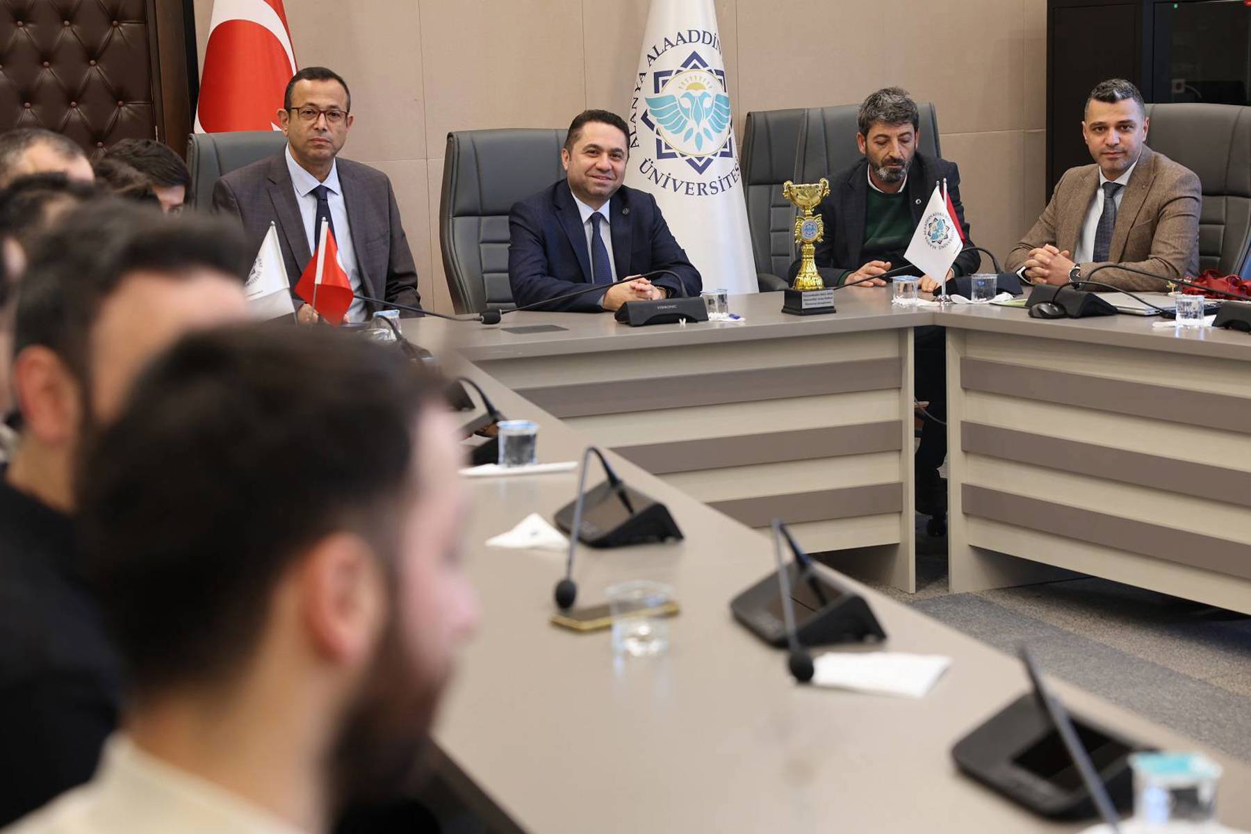 Alanya Alaaddin Keykubat Üniversitesi (ALKÜ) proje ve bilimsel çalışmalarına tüm hızıyla devam ederken idari ve akademik personelin birlik ve beraberliğinin artması adına çeşitli programlar düzenlemeye devam ediyor. ALKÜ Birimler Arası Futbol Turnuvası şampiyonu Eğitim Fakültesi Futbol Takımı, kupasını ve ALKÜ Rektörü Prof. Dr. Kenan Ahmet Türkdoğan’ın elinden aldılar. Senato Salonu’nda yapılan kupa törenine Rektör Yardımcısı Prof. Dr. Işık Bayraktar, Sağlık, Kültür ve Spor Daire Başkanlığı Şube Müdürü Bülent Sular, turnuva koordinatörü Alişan Oğuz İncir ve Eğitim Fakültesi Futbol Takımı katıldı.