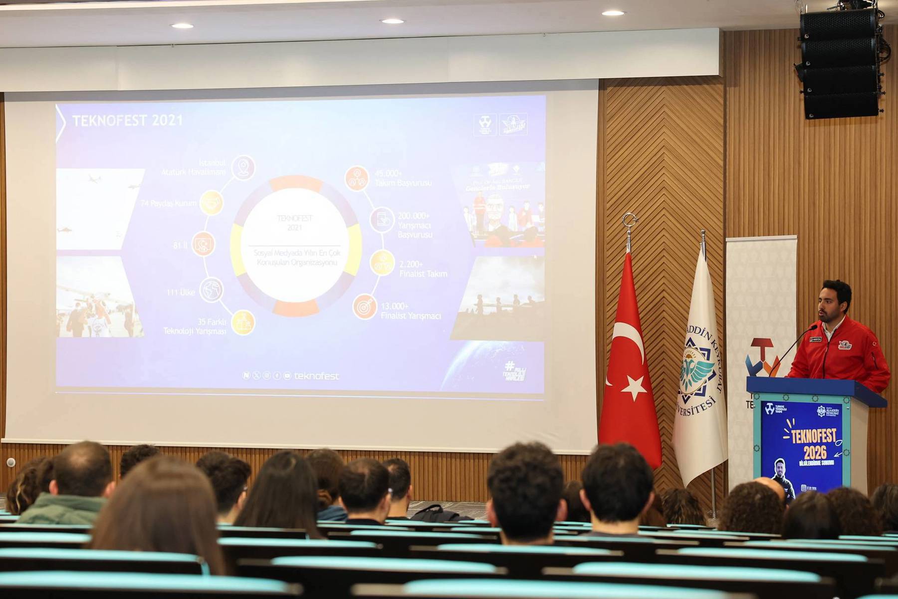 Bu yıl 30 Eylül-4 Ekim tarihleri arasında Şanlıurfa’da yapılacak TEKNOFEST 2026 yarışmasına katılmaya hazırlanan Alanya Alaaddin Keykubat Üniversitesinde (ALKÜ) T3 Vakfı Antalya Deneyap Sorumlusu Halil İbrahim Akboğa tarafından “TEKNOFEST 2026 Bilgilendirme Sunumu” yapıldı.