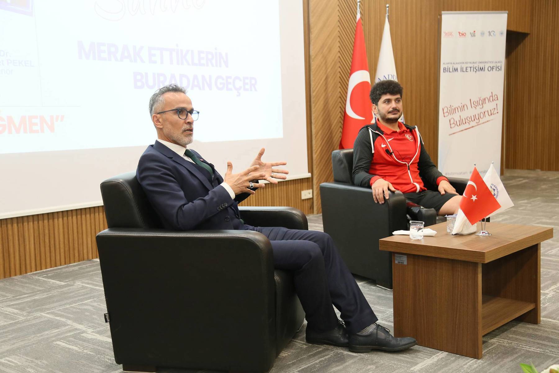 Alanya Alaaddin Keykubat Üniversitesi (ALKÜ) Bilim İletişimi Ofisi öncülüğünde Aytemiz’in katkılarıyla düzenlenen “Aytemiz Sahne – Merak Ettiklerin Buradan Geçer” program serisinin üçüncüsü yapıldı. Serinin üçüncü bölümünde Türkiye'de ve dünyada “Ampute Messi” olarak tanınan milli sporcu Barış Telli ve Antrenörü Prof. Dr. Hacı Ahmet Pekel, “Her Şeye Rağmen” isimli düzenlenen konferansta Alanyalılarla buluştu. Öğrencilerin ve vatandaşların yoğun katılım gösterdiği programda Telli, çocukluğunda geçirdiği trafik kazasından dünya şampiyonluklarına uzanan, “imkânsız” kelimesini hayatından sildiği ilham verici yolculuğunu paylaştı. ALKÜ Alev Alatlı Konferans Salonu’nda yapılan programa Rektör Yardımcısı Prof. Dr. Işık Bayraktar, Alanya Belediyesi Engelsiz Yaşam Merkezi Müdürü Münir Altıoğlu, Alanya Mevlüt Çavuşoğlu Spor Lisesi Müdürü Taner Yıldırım, akademisyenler, öğrenciler ve vatandaşlar katıldı.