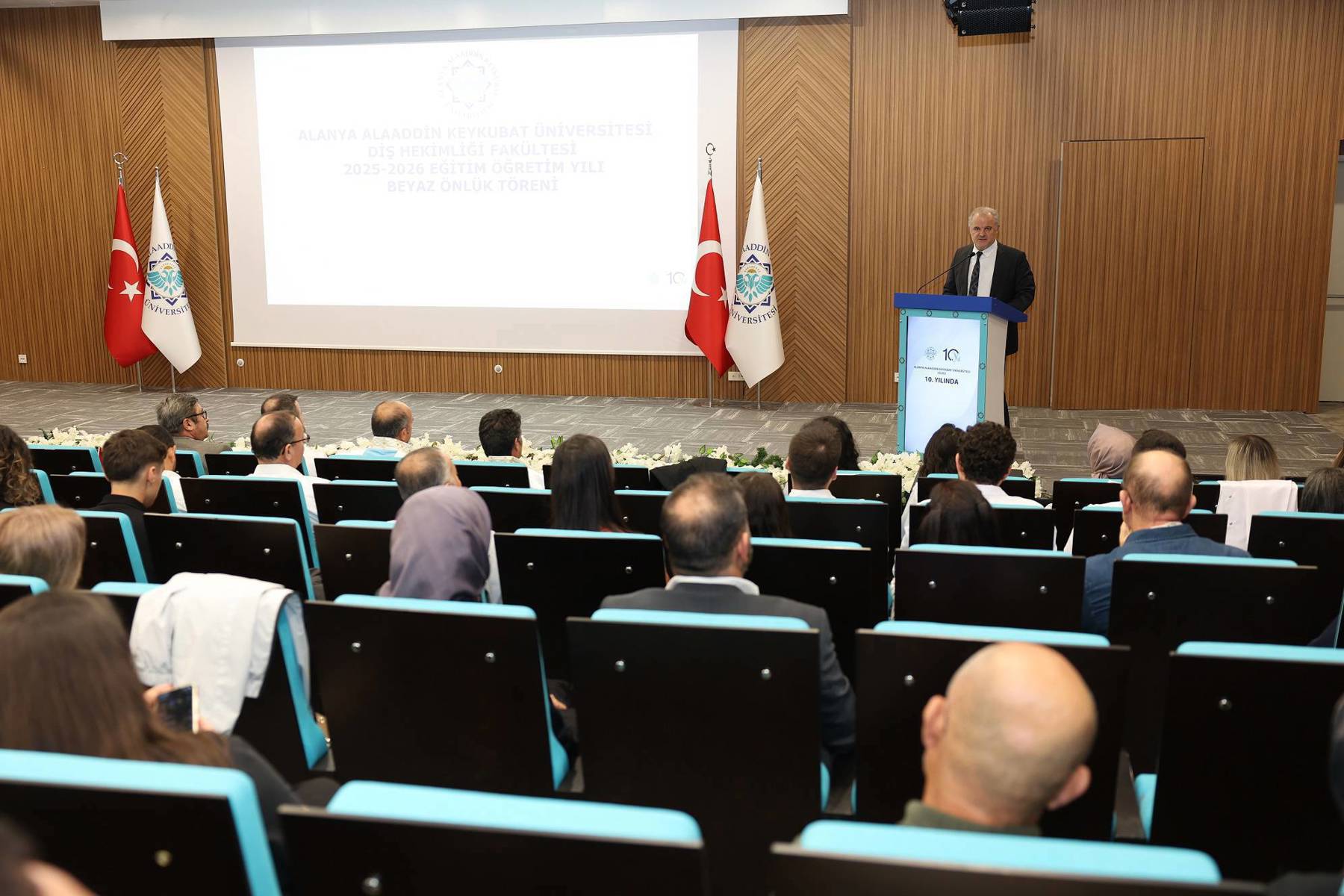 Alanya Alaaddin Keykubat Üniversitesinde (ALKÜ) yeni dönemin başlamasının ardından ALKÜ’lü öğrenciler, mesleklerinde ilk adım atmanın heyecanını yaşamaya devam ediyor. Bu kapsamda ALKÜ Diş Hekimliği Fakültesi tarafından bu yıl fakülteye başlayan öğrencilere 2025-2026 Eğitim-Öğretim Yılı Beyaz Önlük Giyme Töreni düzenlendi. Rektörlük Binası Alev Alatlı Konferans Salonu’nda yapılan törene Rektör Yardımcıları Prof. Dr. Atıf Bayramoğlu, Prof. Dr. Mehmet Kılıç, Diş Hekimliği Fakültesi Dekanı Prof. Dr. Mehmet Akın, önceki dönem dekanlardan Prof. Dr. İhsan Levent Aral, Antalya Diş Hekimleri Odasından Diş Hekimi Mürüvet Turhan, dekanlar, MYO müdürleri, akademisyenler, aileler ve öğrenciler katıldı.