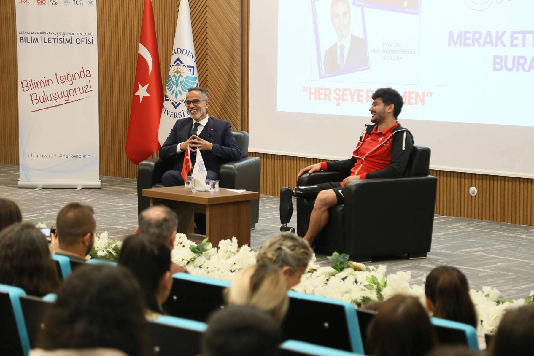 Alanya Alaaddin Keykubat Üniversitesi (ALKÜ) Bilim İletişimi Ofisi öncülüğünde Aytemiz’in katkılarıyla düzenlenen “Aytemiz Sahne – Merak Ettiklerin Buradan Geçer” program serisinin üçüncüsü yapıldı. Serinin üçüncü bölümünde Türkiye'de ve dünyada “Ampute Messi” olarak tanınan milli sporcu Barış Telli ve Antrenörü Prof. Dr. Hacı Ahmet Pekel, “Her Şeye Rağmen” isimli düzenlenen konferansta Alanyalılarla buluştu. Öğrencilerin ve vatandaşların yoğun katılım gösterdiği programda Telli, çocukluğunda geçirdiği trafik kazasından dünya şampiyonluklarına uzanan, “imkânsız” kelimesini hayatından sildiği ilham verici yolculuğunu paylaştı. ALKÜ Alev Alatlı Konferans Salonu’nda yapılan programa Rektör Yardımcısı Prof. Dr. Işık Bayraktar, Alanya Belediyesi Engelsiz Yaşam Merkezi Müdürü Münir Altıoğlu, Alanya Mevlüt Çavuşoğlu Spor Lisesi Müdürü Taner Yıldırım, akademisyenler, öğrenciler ve vatandaşlar katıldı.